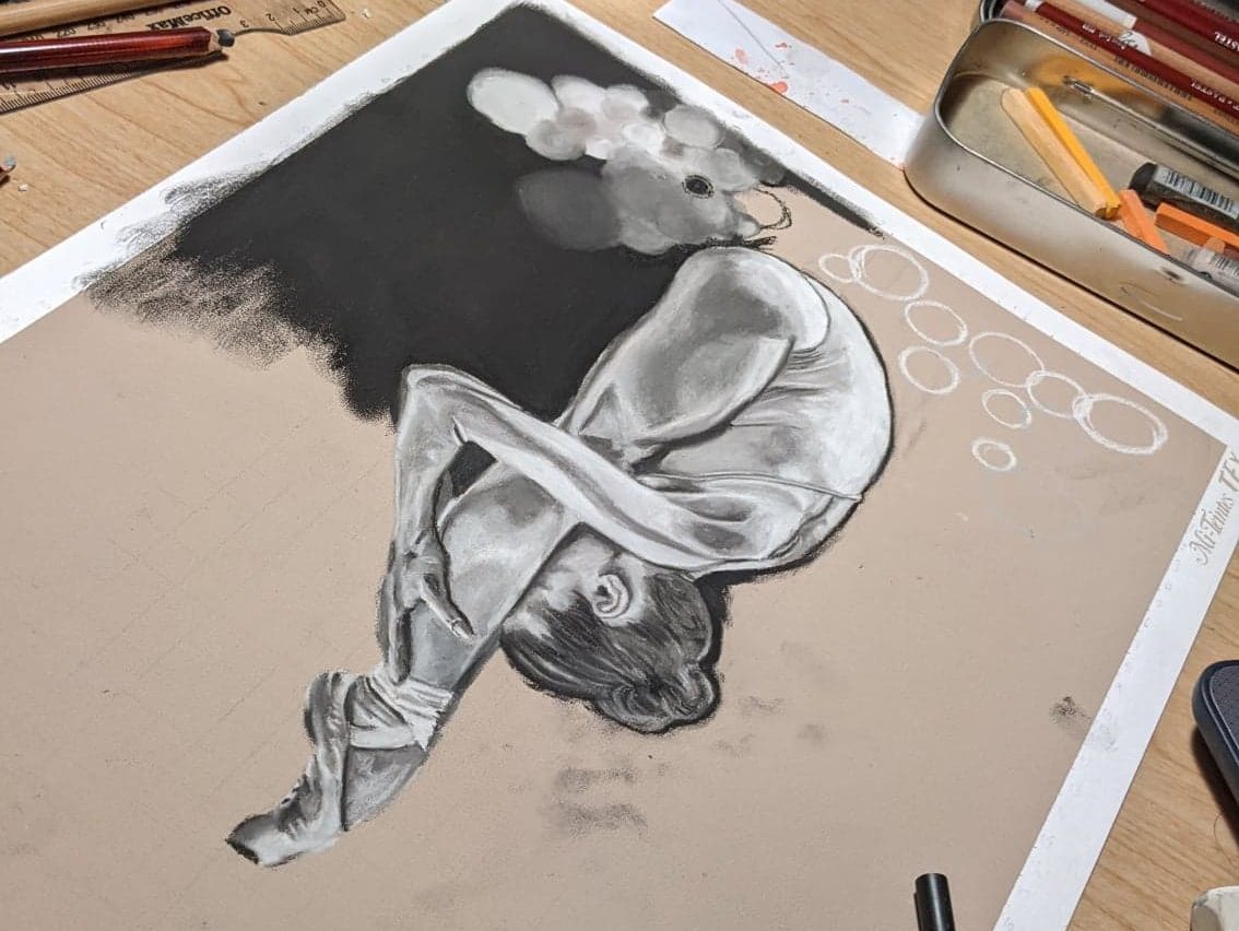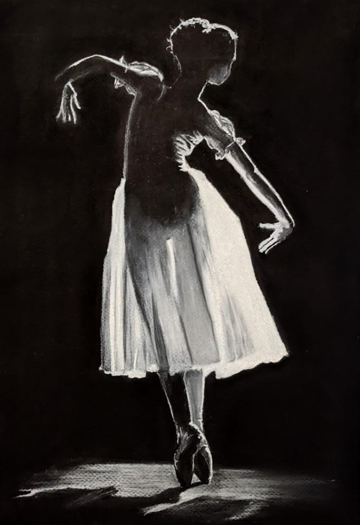 I bought a pad of black pastel paper for rough copies and discovered it was quite awful to work with even for drafts, not holding the pigments and being generally difficult. On the upside it did inspire me to go on with a series of white charcoal, low-light ballet paintings. I am a great fan of the simplicity of highlighting only those areas touched by light.
