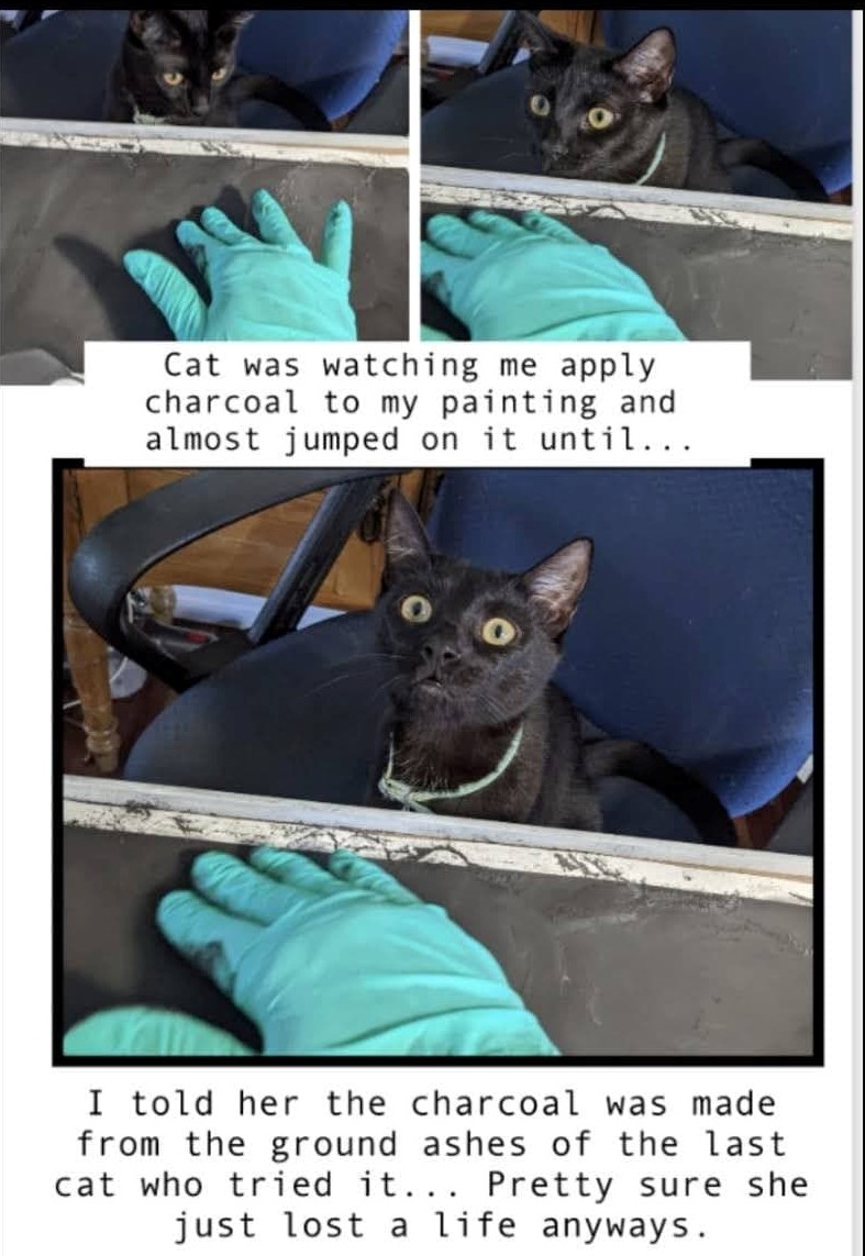 I always leave the background until later in the piece, often at the end. It gives me a better sense of what will suit the focal piece best as unless it’s a commission, my work takes on its life as it progresses. The flexibility of the imagination is the attraction in the process. For this piece, I’m creating bokeh – a familiar term of Japanese origins to photographers who utilise lens settings that create out of focus pinpoints of lighting. It’s simple, quick and effective. To create the bokeh I roughly sketch out where the circles will lay, then apply a rich, soft black charcoal as a base . I then create a series of various sized circles using a range of light to heavy layers of white charcoals. At this point it’s a matter of blending and blurring, and adding the next layers until the final highlight details are added. I discovered that disposable gloves protect my fingers when blending large areas and provide a seamless, smooth finish to the layer. I also discovered this process facinates Karma, who thought it was a game and was intent on grabbing my hand!