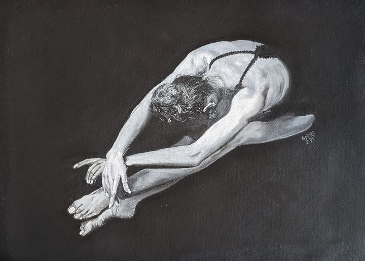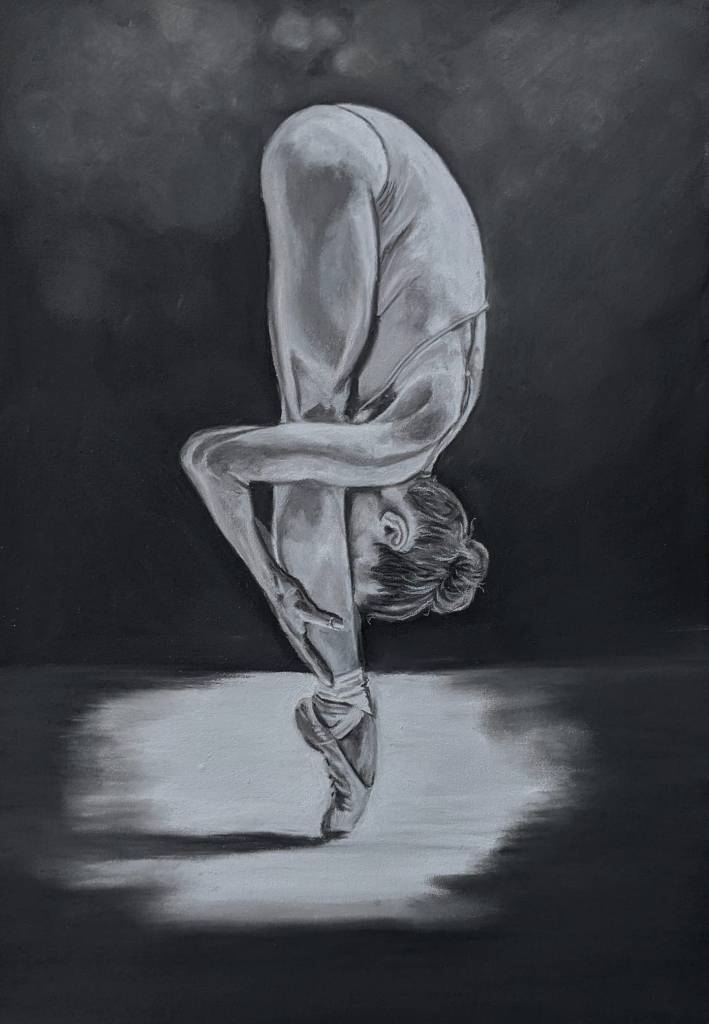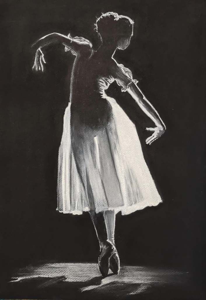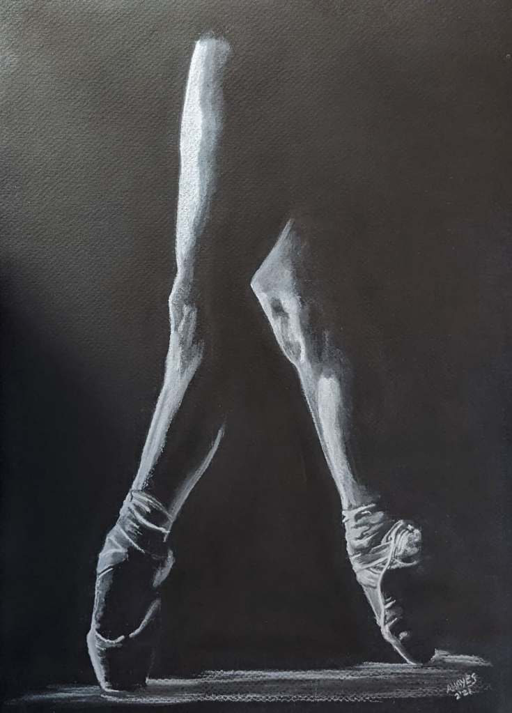 I bought a pad of black pastel paper for rough copies and discovered it was quite awful to work with even for drafts, not holding the pigments and being generally difficult. On the upside it did inspire me to go on with a series of white charcoal, low-light ballet paintings. I am a great fan of the simplicity of highlighting only those areas touched by light.