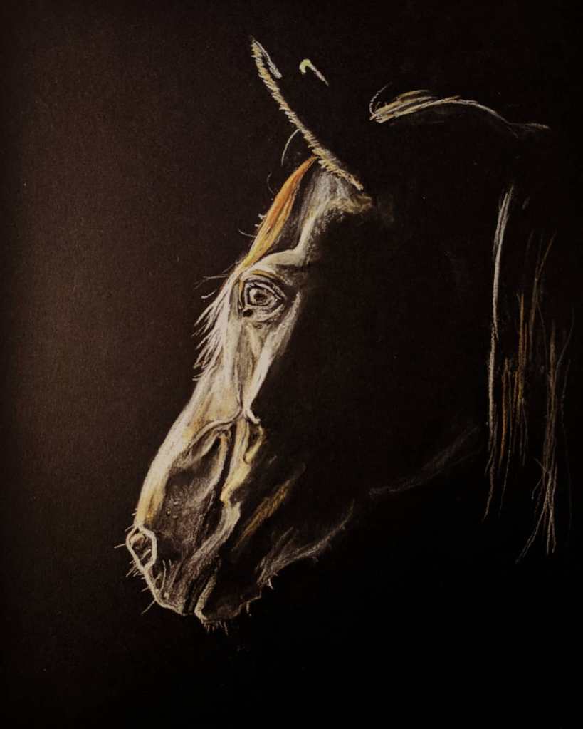 ‘Milo’ is actually a glorious chestnut gelding. His charcoal portrait painting uses a combination of soft black charcoals and soft white pastels for the larger areas, and medium General’s Charcoal White pencils for the details – the latter are divine to work with – highly recommend. Here’s the debate however. While white charcoal is a legitimate Japanese product – “Binchōtan” – it is actually a light gray ash colour at most.