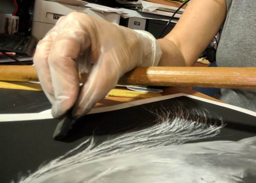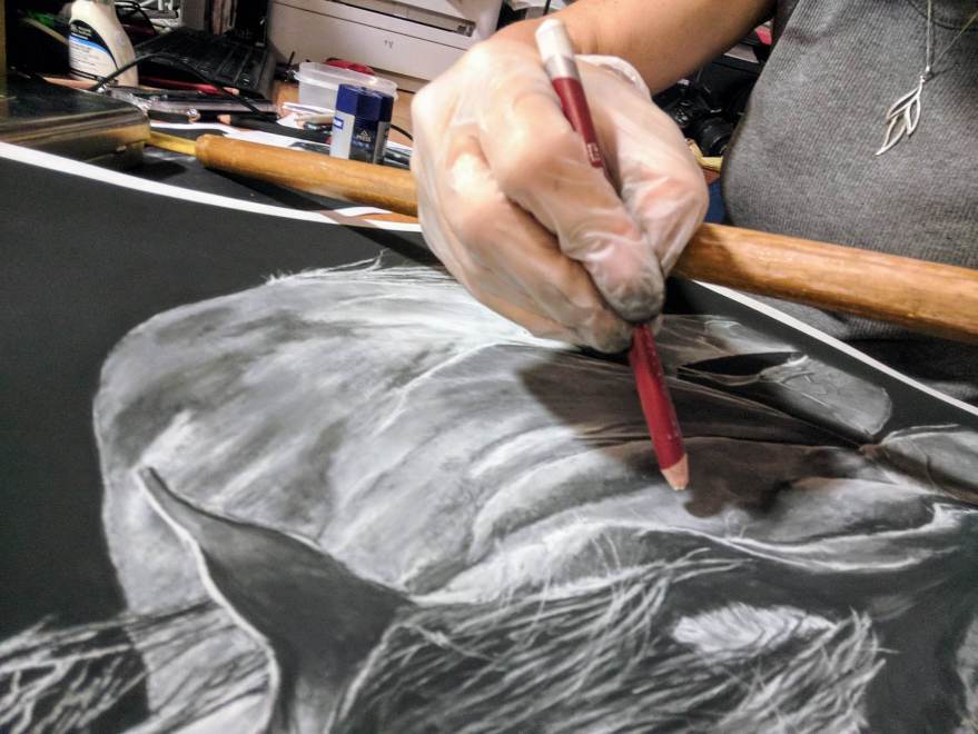 The white charcoal pencils I use are still dense and chalky but give the beautiful luminescence where needed. The lighter values were mostly created by adding the white layers directly on top of black. This is the simplest technique and interestingly creates cool tones as the whites give the charcoals a subtle blue hue. Deliscious! I used Canson Mi-Teintes paper which I mentioned in my Portraits Series. I tend to work from top right to bottom left (right-handed) to avoid smudging work and use a sheet of glassine paper to rest my arm on. Baking paper is a cheaper alternative and equally effective although I recommend using glassine paper to protect finished works. Another quick tip, rest you arm on a piece of wooden dowl for final quick touch ups to keep it raised off the paper.