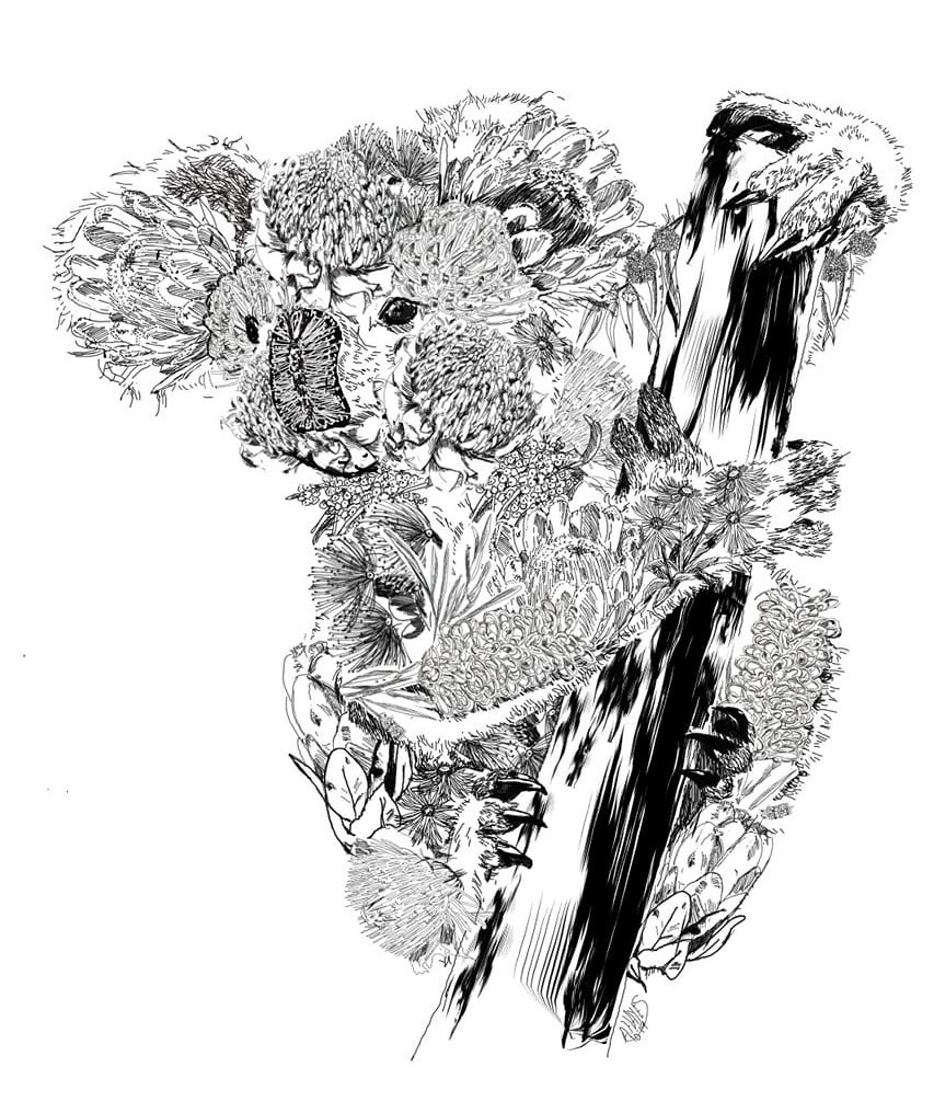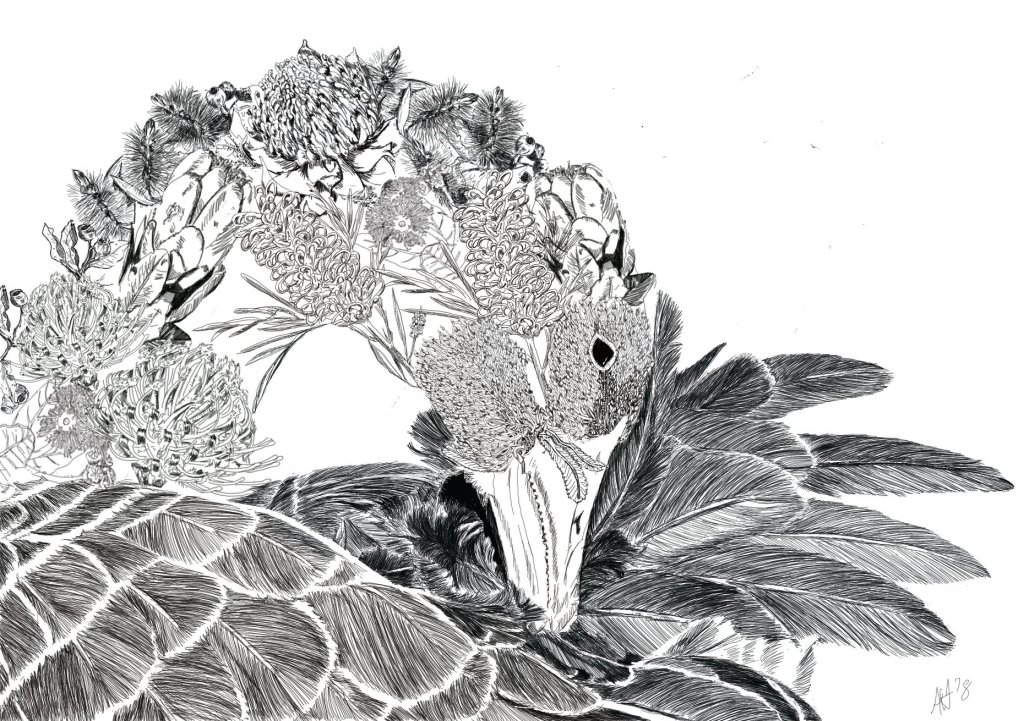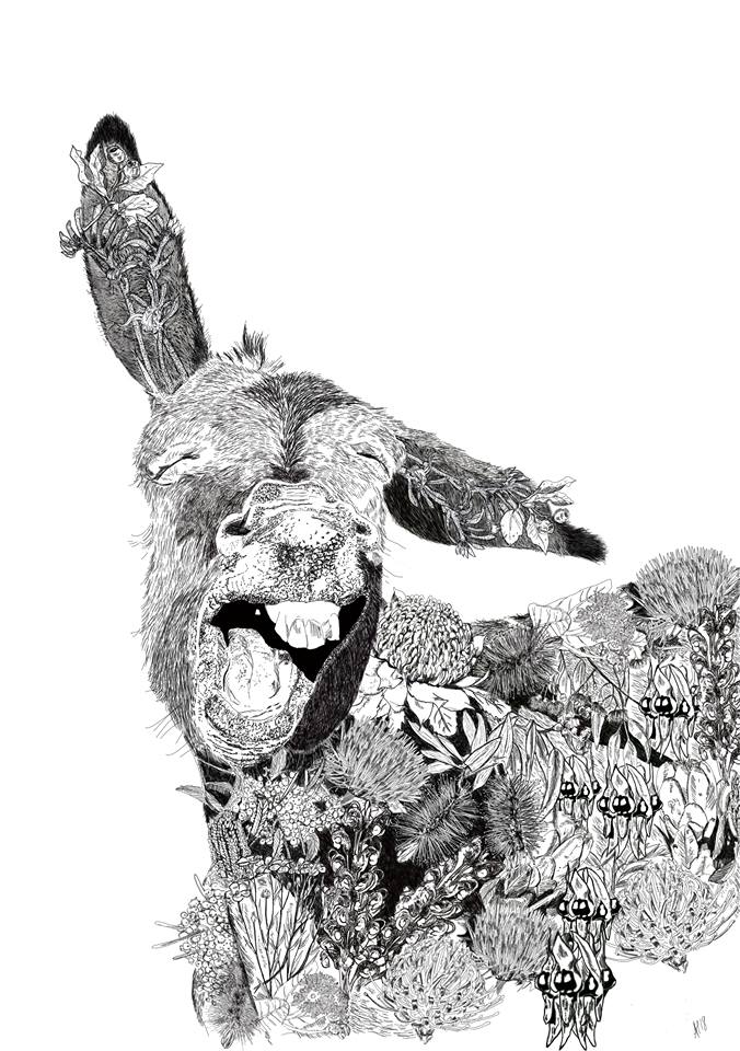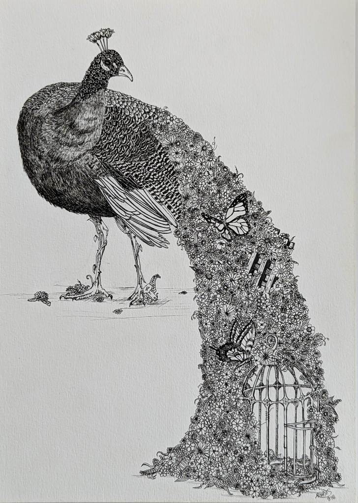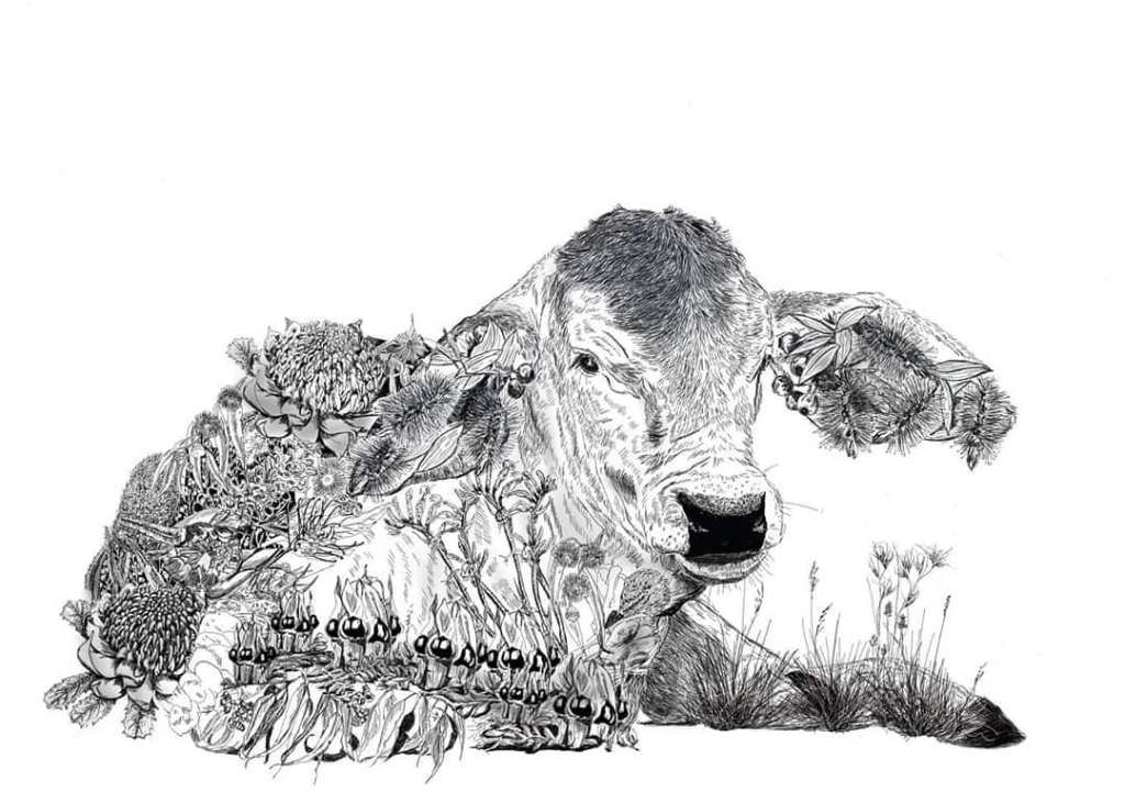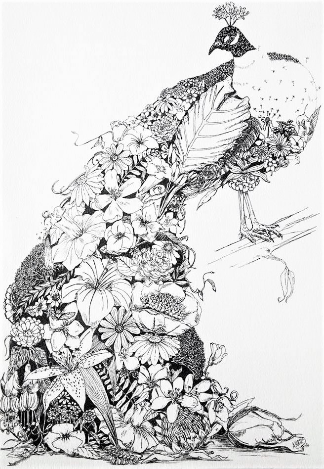 I was approached to do this peacock commission many years ago and adapted my simple doodling to more detail. This led to another series which I periodically add to, but I have limited myself to only Australian flora. My first one was from one of my own reference photographs of a newborn brahman calf.