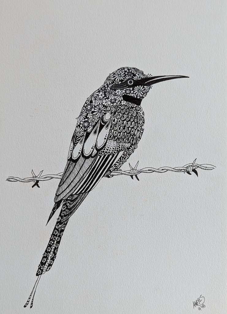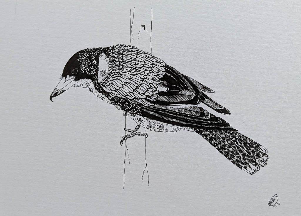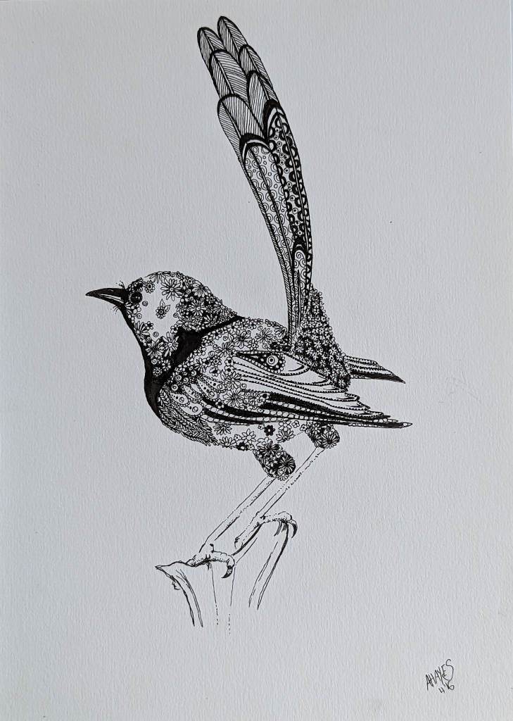 Doodling is again, super fun and easy because there are no set rules. My preference is to use tiny flowers and create tonal values through colouring in the background around the flowers or symbols, sometimes even completely blacking out an area. Lighter tones can be created by leaving space between doodles, choosing light or looser designs to doodle. Again I sketch out zones in my chosen image and work from there.