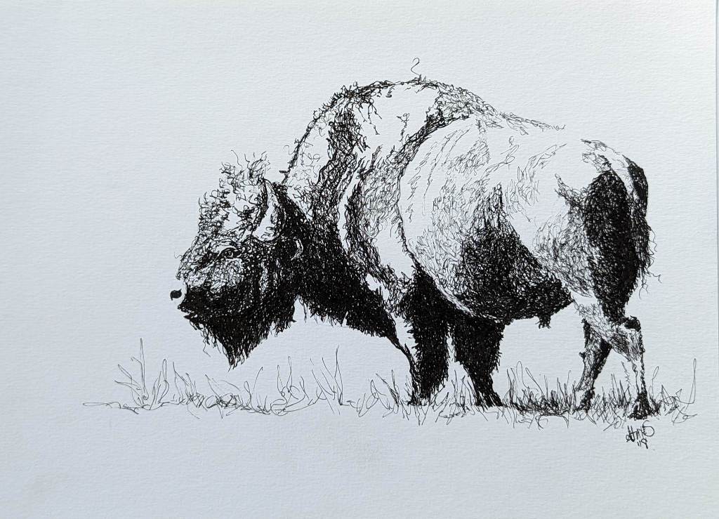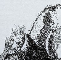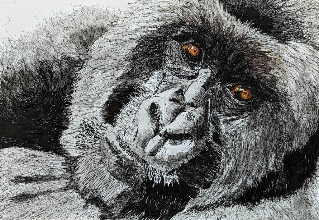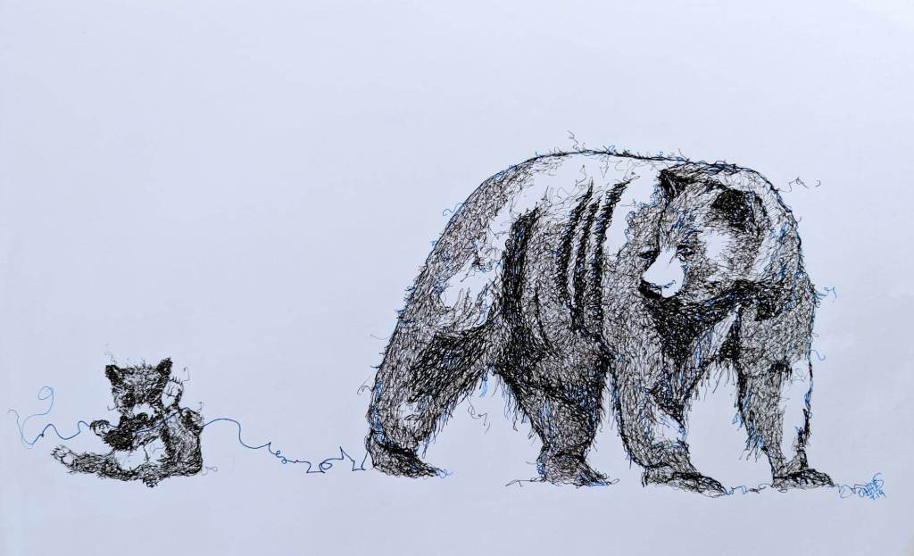 Scribble artwork is precisely that. It’s scribble but this form can be delightfully elegant as well as fun and messy and consists of crude messy looping similar to the movements used in handwriting. It has a starting point and tonal values are created by scribbling over and over until the required darkness is achieved. When I draw up the picture I mark in outlines, the important lines, and basic shapes of where shadows will need to be added. I tend to move around the page with minimal lifting of the pen nib. The untidy squiggles for outline effect are added as the grande finale. Occasionally I will add a pop of colour – such as the Gorilla’s eyes and the blue yarn in the Bear drawing.