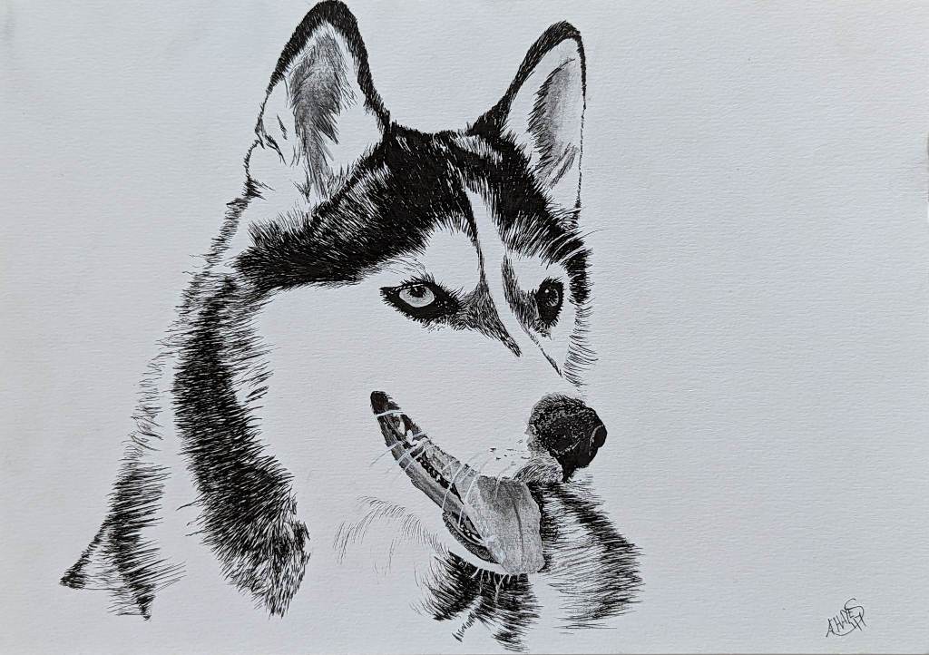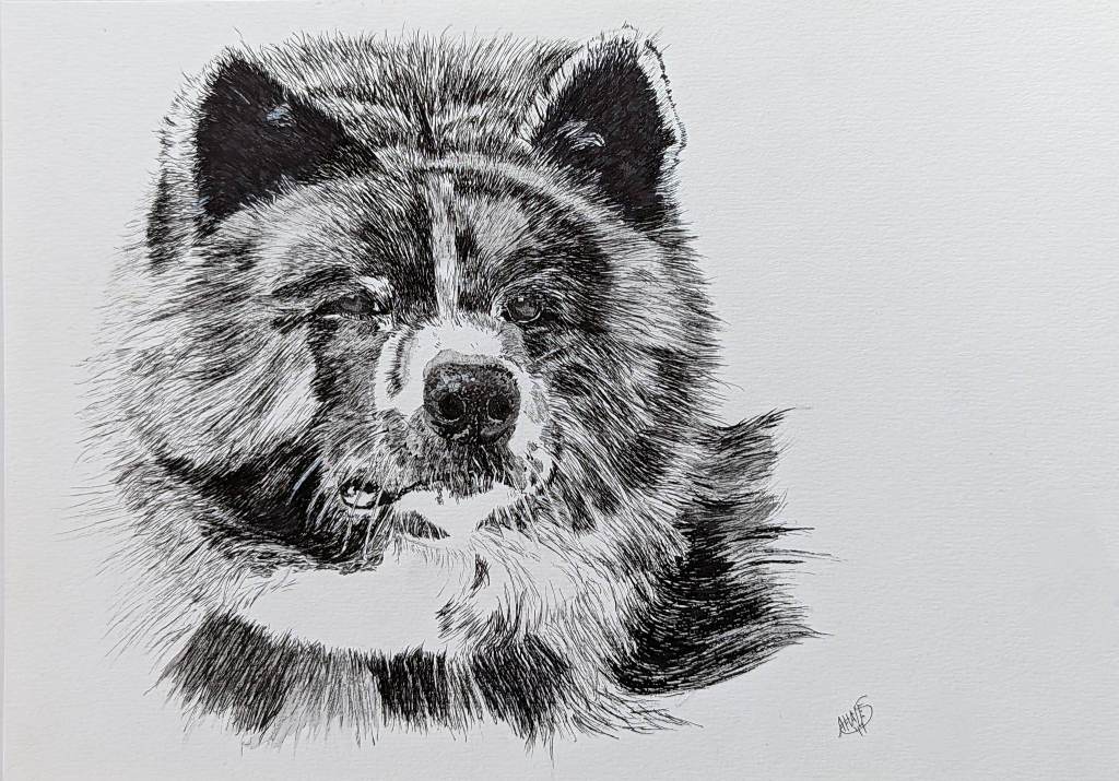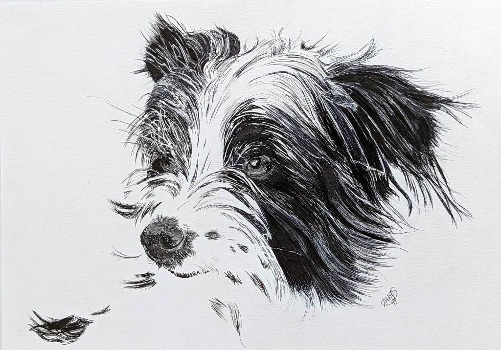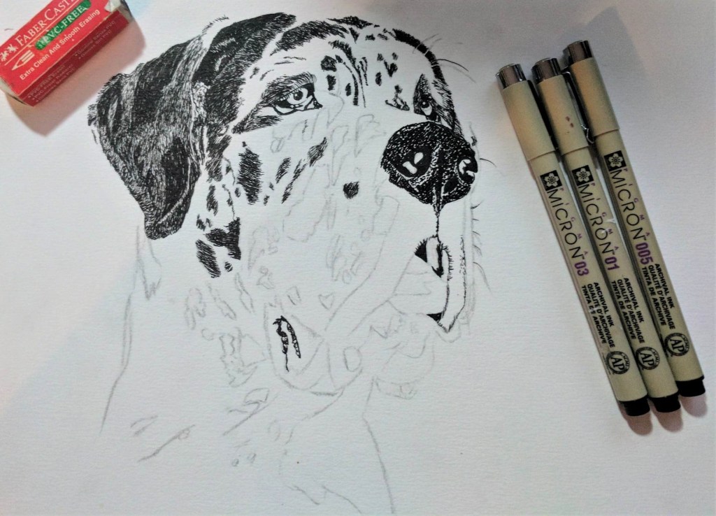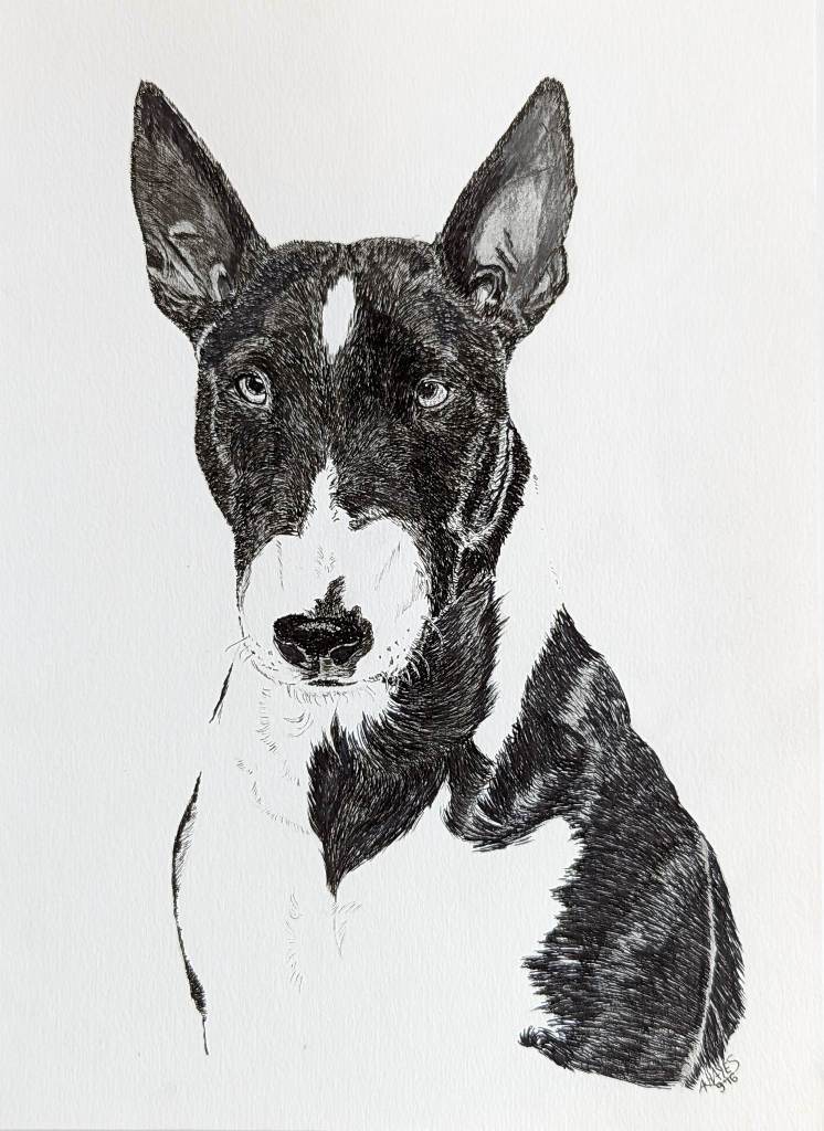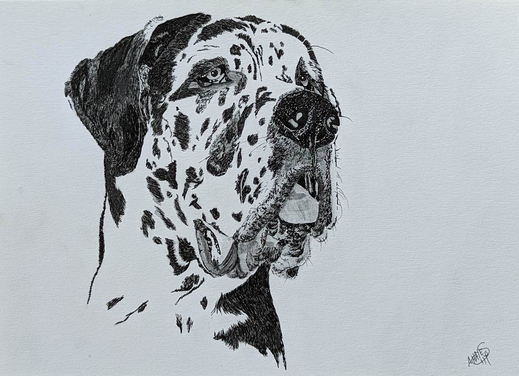 This style is particularly easy but requires a very clear reference photo if you are unfamiliar with the typical lay of a dog’s hair. Each hair is applied individually only in the black parts of the dog. I purposefully selected dog breeds that are legitimately this colouration. Once the dog is sketched out with the basic markings, each hair is applied in short strokes and layered depending on the darklness of the patch. Stroke length should be in proprotion to the natural coat length. My favourite pens for these works were Pigma Micron’s which come in sizes from the super-fine .005 to the large blunt tips of the .08. They don’t bleed, and are water-proof, chemical-proof and fade resistent.